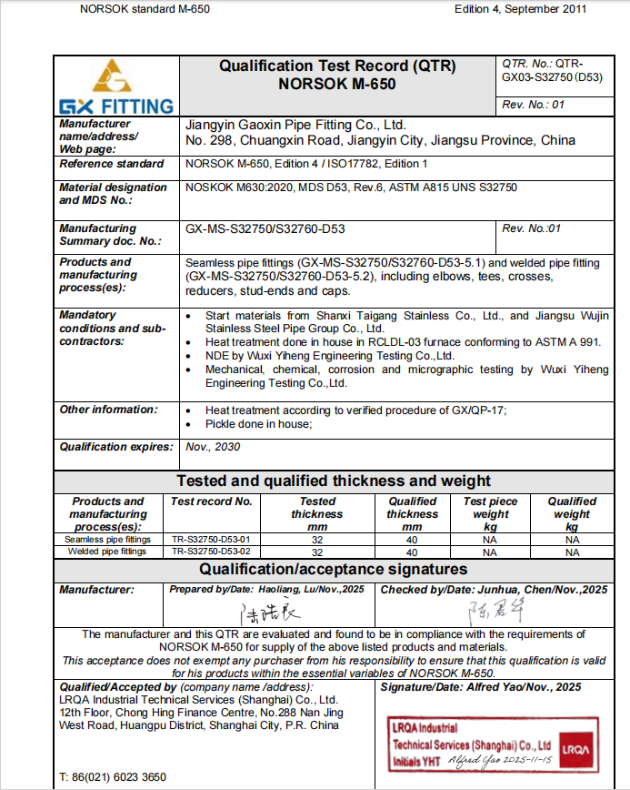 Şirketimizin, beş önemli korozyona dayanıklı alaşım kalitesi için NORSOK M650 sertifikasını başarıyla aldığını paylaşmaktan mutluluk duyuyoruz: S32205, S31803, S32750, S32760 ve S31254.
