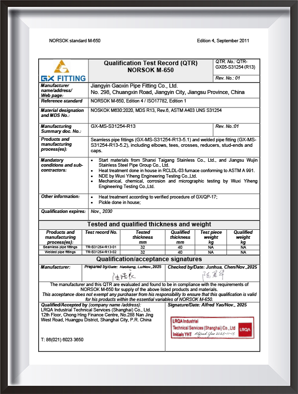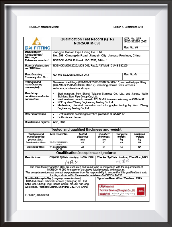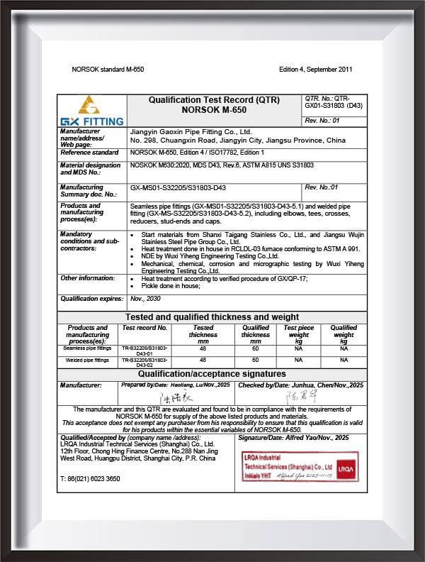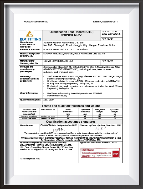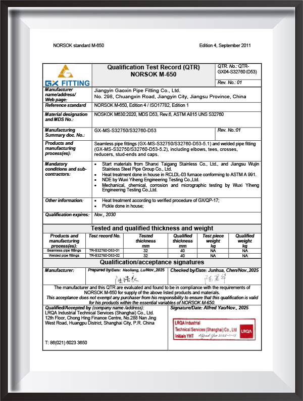 PED, AD2000, EAC, ABS, BV, DNV, NORSOK M650, ISO9001, ISO14001, ISO45001, vb.